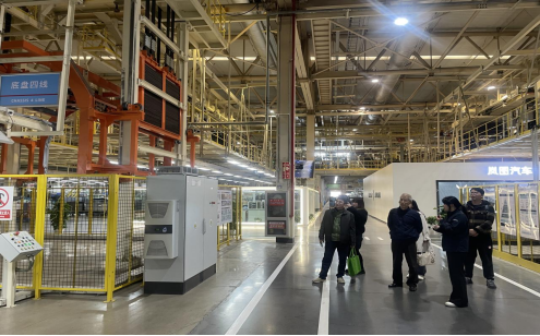 然后,实地参观了总装车间。该车间以高效智能制造著称,采用了全球首创的2000MPa防撞钢、L2.9级智能驾驶等技术,每118秒即可下线一辆新能源汽车。车间内195台机械臂协同工作,实现多车型共线生产,并通过IoT大屏实现十年质量回溯。此外,车间还展示了2200MPa热成型钢门环、电池包双重防护等安全技术。