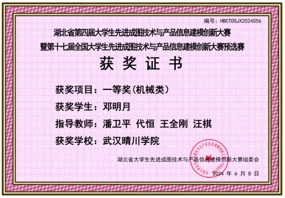 该竞赛内容包括图学基础知识、计算机建模、尺规绘图,比赛全程录屏、录像。学校历年来高度重视,学院党总支、团总支、各课部、辅导员老师积极组织学生报名、指导学生参赛,同时在学院发明创新协会的组织、帮助下,在师生的共同努力下,2024年最终获湖北赛区一等奖3项、二等奖2项、三等奖3项,共8项,成功入围国赛,并获国家级二等奖3项、三等奖2项。