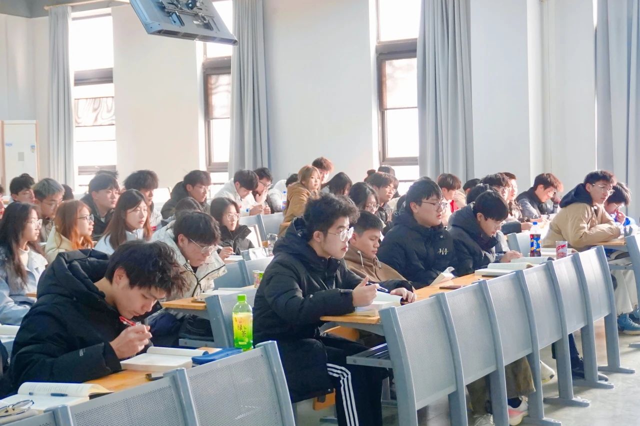 同学们全神贯注地听讲、做笔记