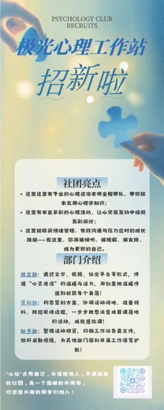 (3)设计制作心理宣传海报、宣传单、横幅、展板,还能参与各类专题活动的视频制作,展现你的创意。