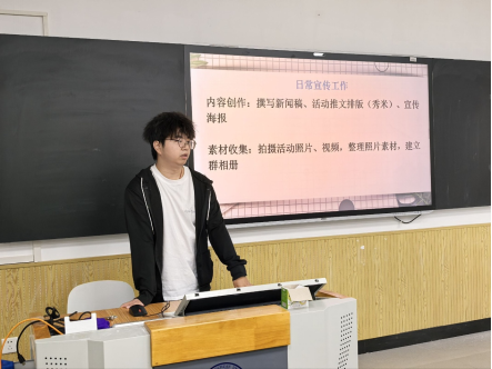 文艺部部长王怡文以“策划与执行”为主线,系统讲解文艺活动开展要点。她详细拆解活动策划全流程,从创意构思到落地执行逐一指导;传授人员沟通技巧,助力干事高效协调各方资源;同时开展基础美工教学,激发团队创造力,为打造校园精彩文艺舞台凝聚力量。