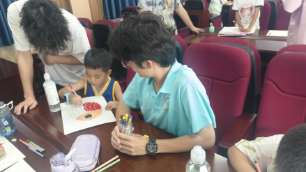 曾子谦老师捧着彩铅,目光追着黄蓝球衣小男孩的画笔跑。画纸上红橙颜料晕开,像把童真碾碎成光,洒在桌面。旁边白衫身影微微俯身,和这方小天地共享创作,水杯、笔袋都成了见证者,看孩子用色彩敲开想象的门。