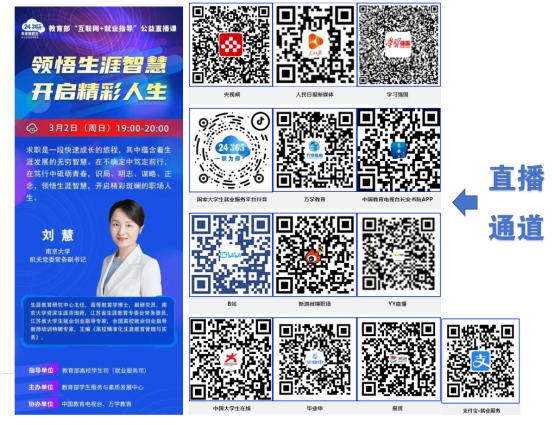 根据省就业部门相关通知,本周日(3月2日19:00-20:00)教育部“互联网+就业指导”公益直播课——播出“领悟生涯智慧 开启精彩人生”,邀请南京大学资深生涯咨询师刘慧做主题分享。课程聚焦生涯发展中的职业选择,分享识局、明志、谋略、正念等生涯智慧,引导学生于变局中笃定前行,开启精彩斑斓的职场人生。